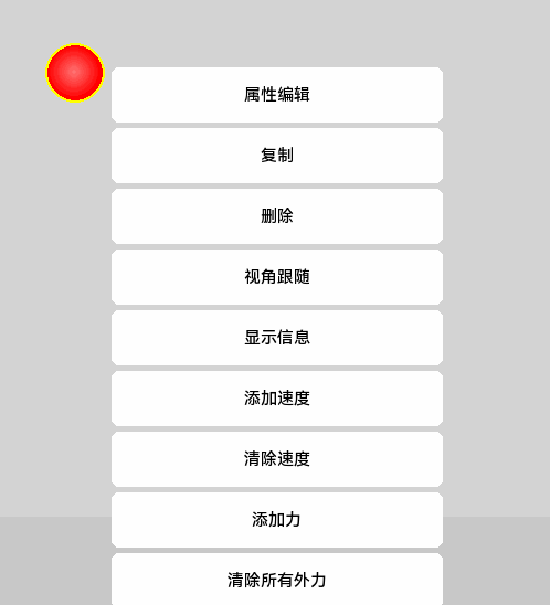 如同,在选中右侧物体菜单中的球选项后,选项会显示高光,此时点击摄像机范围内的空白处可以生成一个默认属性(红色,半径为5,质量为1)的弹力球